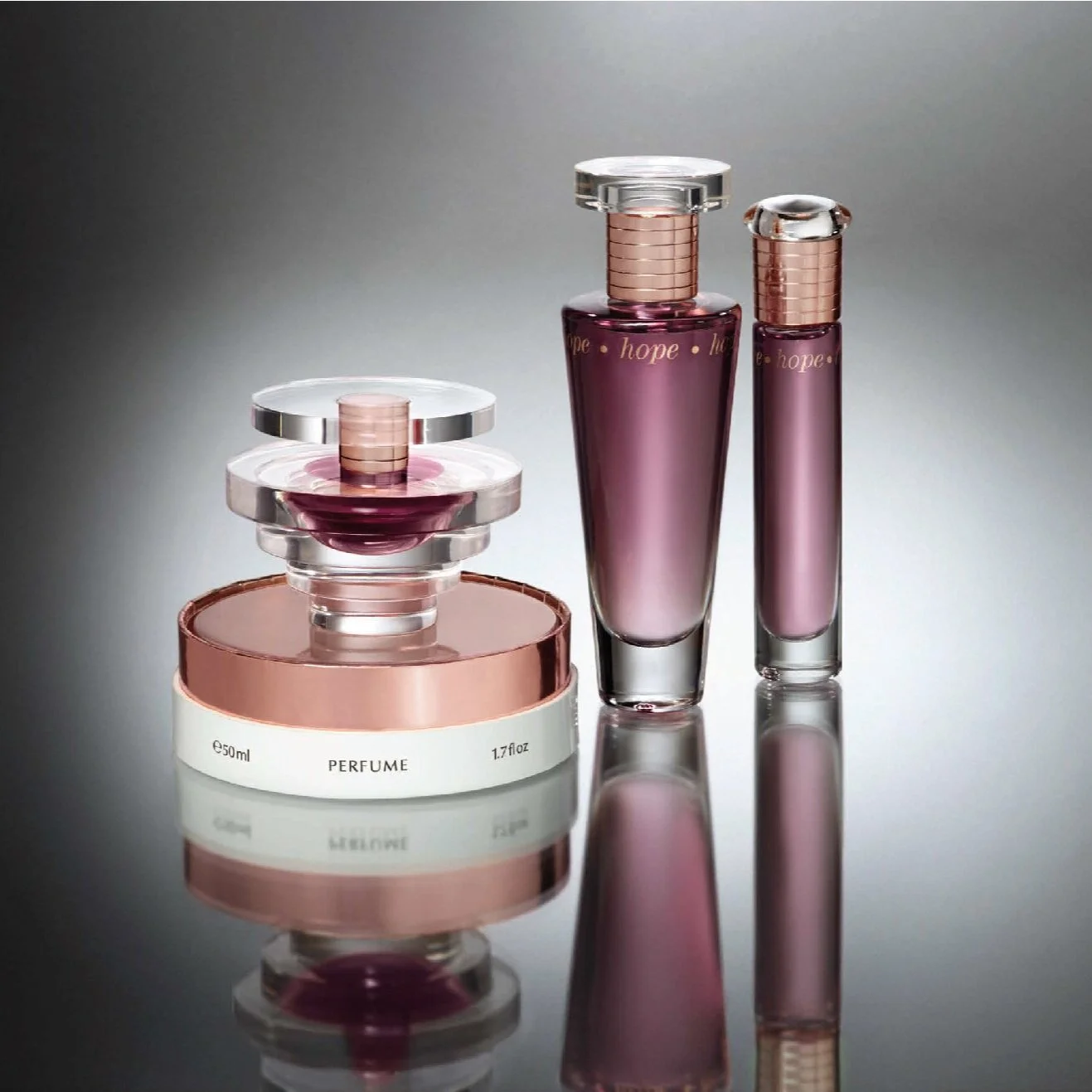 The creation of the Hope Night flanker was enhanced by the addition of the new, compelling Art Deco crystal perfume bottle. The round glass stopper with its rose gold ribbed stem sits upon a round stepped back bottle with sharp edges and a purple lacquered base. Hope fragrances is the first brand in many years to launch a real parfum. They realize that the consumer values image and luxury and beauty.