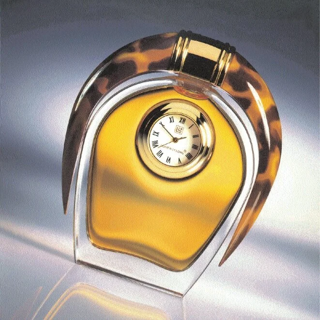 Lucien Lelong was a renoun French fashion designer who designed couture from the 1930’s through the 50’s. He is credited with inventing the Pret a Porter concept. He had designed many beautiful perfumes during those years in classic bottles. Our client had purchased the brand and asked us to create a new Lelong fragrance in his spirit. In doing research on his remarkable career, we found a photo of his salon with a mantle clock that was surrounded by two elephant tusks. We designed a dramatic bottle that contained a working clock in a horse shoe shaped bottle topped with double tusks covered in tortoise shell pattern.