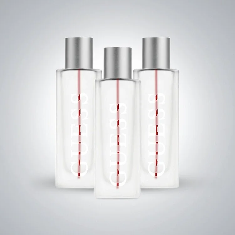 Created to be the Guess signature fragrance. The client wanted to use stock packaging. We used a stock bottle that we had designed for a French glass supplier and screened the front with a frosted panel with the letters of Guess dropped out. The clear fragrance revealed the standard dip tube which we made into a design element by making it red to match the spray orifice. The matte silver cap completed its cool overall persona.