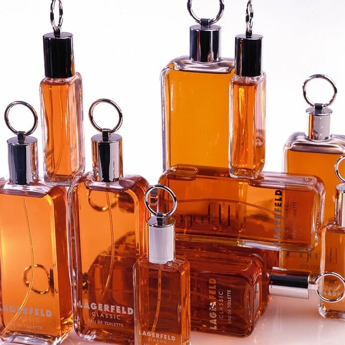 Lagerfeld’s signature woman’s fragrance, the Art Deco bottle was created in the shape of a fan. It was Karl’s favorite accessory both in his fashion shows and his personal symbol. The bottle’s sharp rays creates a dramatic tactile sensation. An engineering feat by the glass maker, the bottle has an inverted neck making the flat gold closure lie flat.